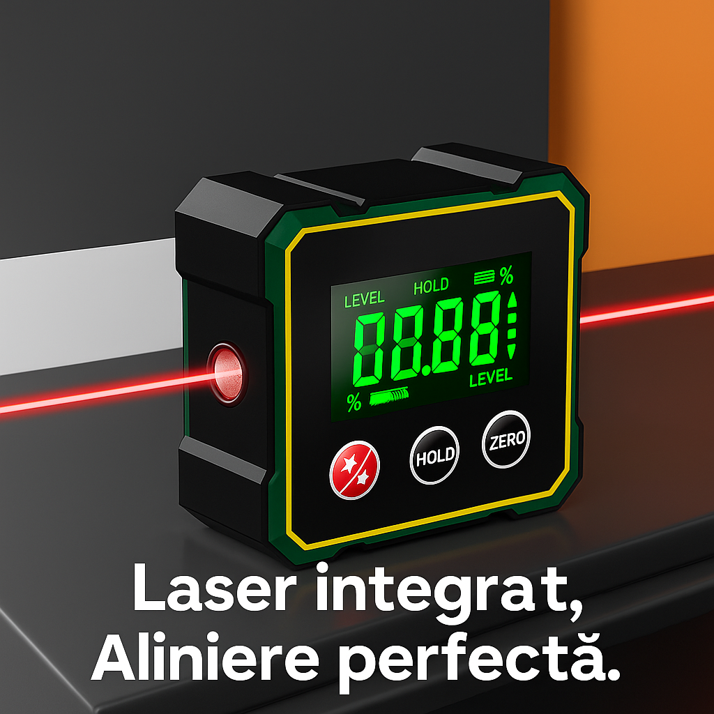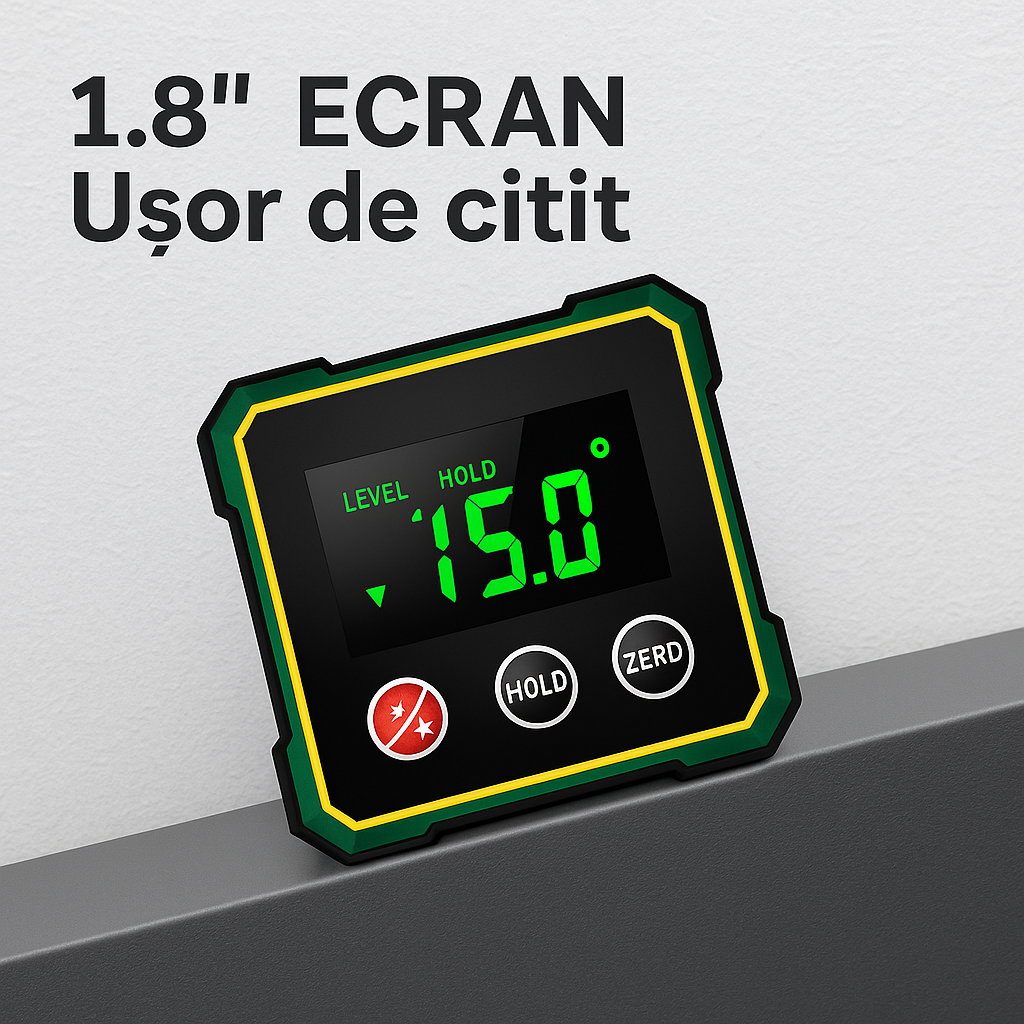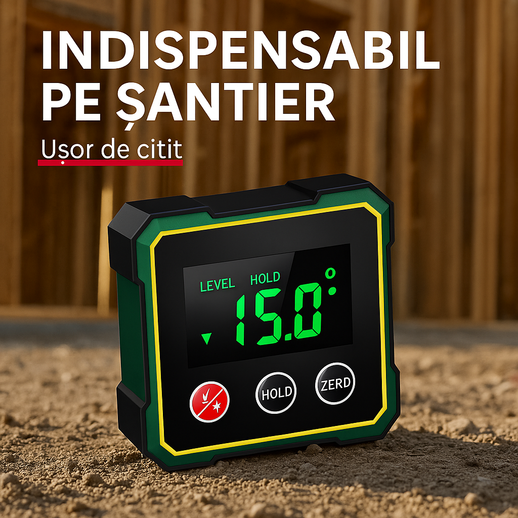 Nu lăsa unghiurile la voia întâmplării! Cu senzorul său de înaltă acuratețe, inclinometrul digital îți indică deviațiile de doar 0,1°, chiar și pe lumină slabă datorită ecranului verde iluminat. Montează, taie și aliniază perfect din prima!