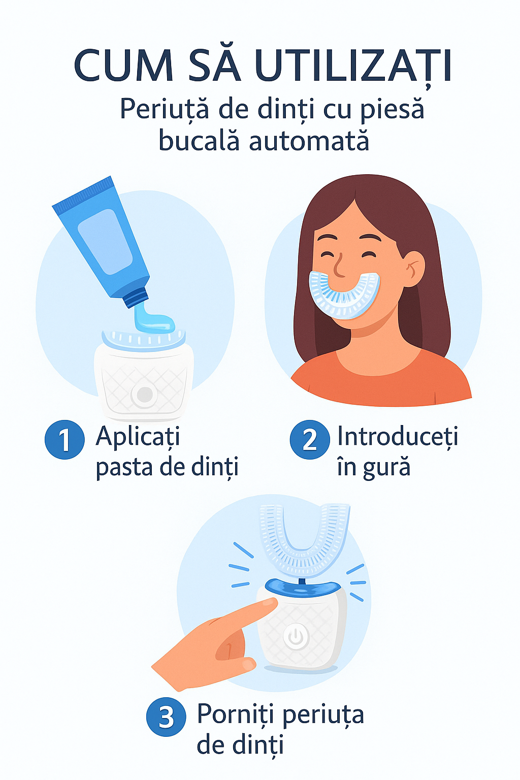 Vrei dinți curați fără bătăi de cap? Periuța automată cu piesă bucală în „U” curăță toate suprafețele simultan, într-un ciclu ghidat de 45 s. Siliconul moale protejează gingiile, iar temporizarea te scapă de cronometrul mental. Specificații: piesă în „U” 360°, temporizator 45 s, bază cu buton/LED. Funcționează cu pastă obișnuită.