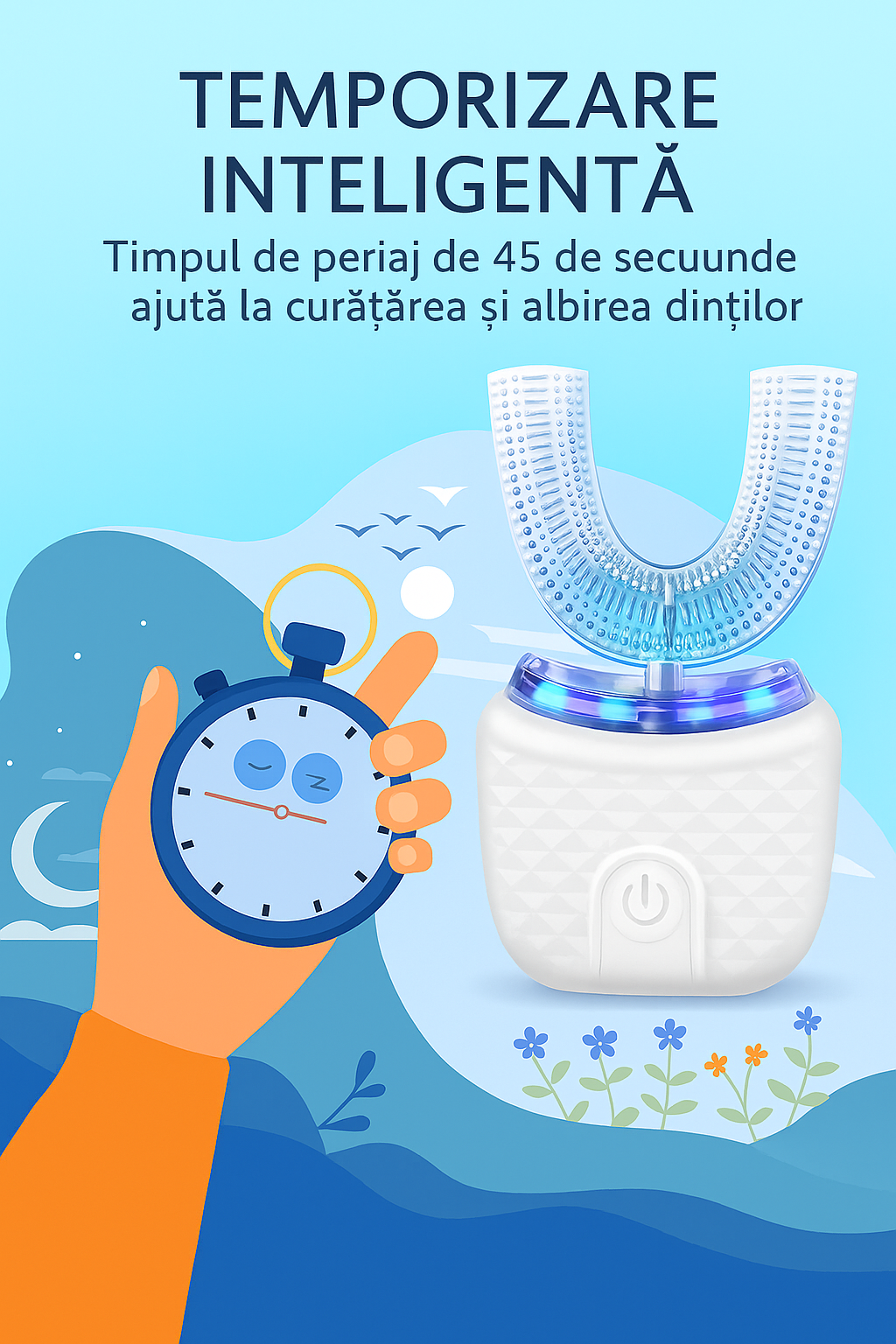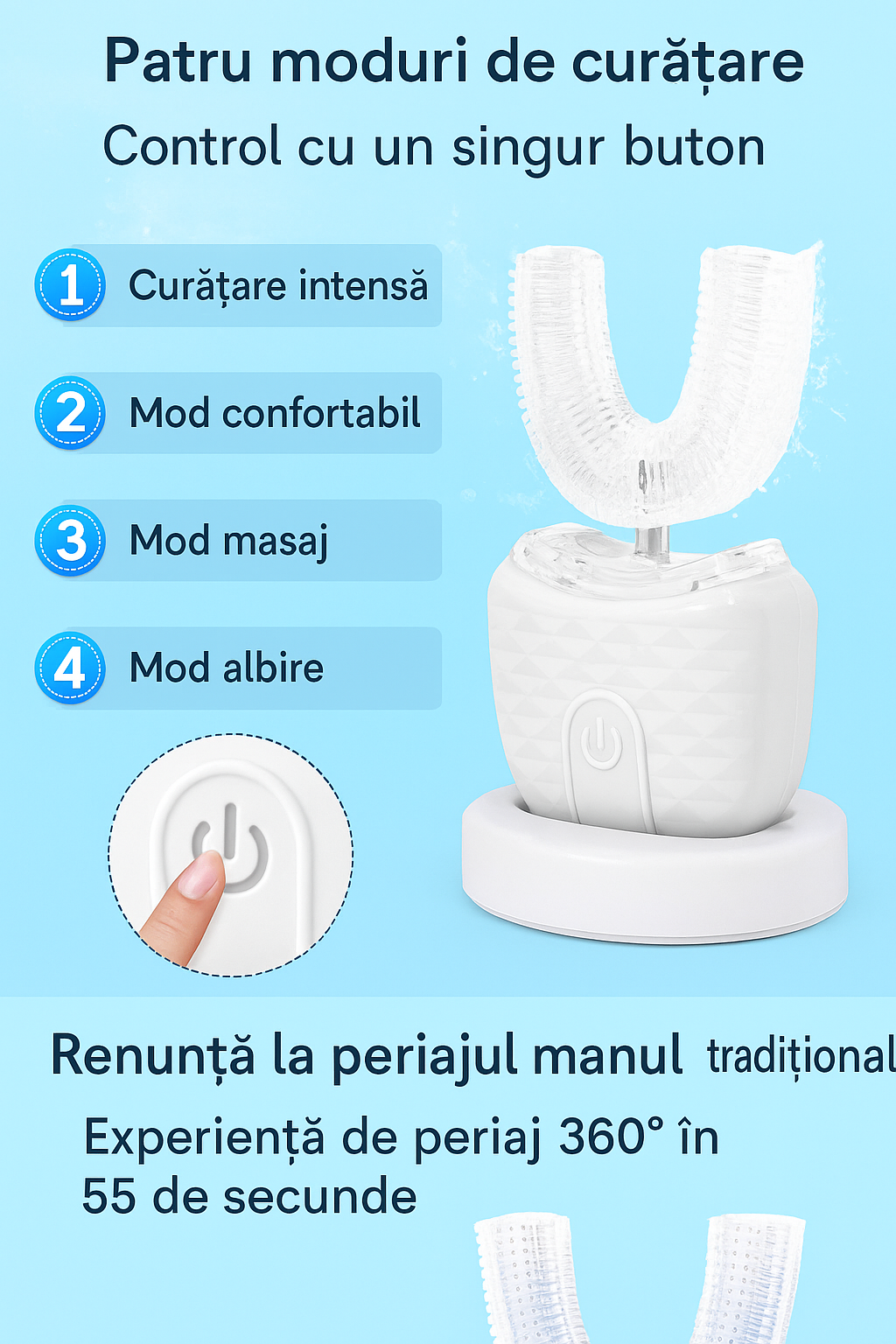 LED-ul integrat indică funcționarea (nu revendică efecte medicale). Un ciclu de 45 s oferă o rutină previzibilă, iar capul în „U” acoperă simultan zonele greu accesibile. Specificații: LED de status, temporizator, cap lavabil.
