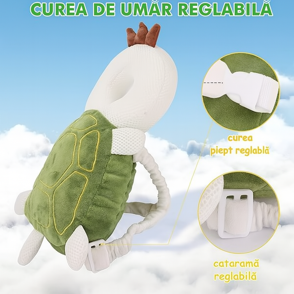 Cu doar 180 g, ShellBuddy cântărește mai puțin decât un body și lasă mâinile libere pentru joacă. Material hipoalergenic, fără miros, cusături fine – zero iritații. Spatele căptușit distribuie presiunea, iar orificiul central ține capul perfect în ax. Ajută-l să-și testeze limitele fără vânătăi.